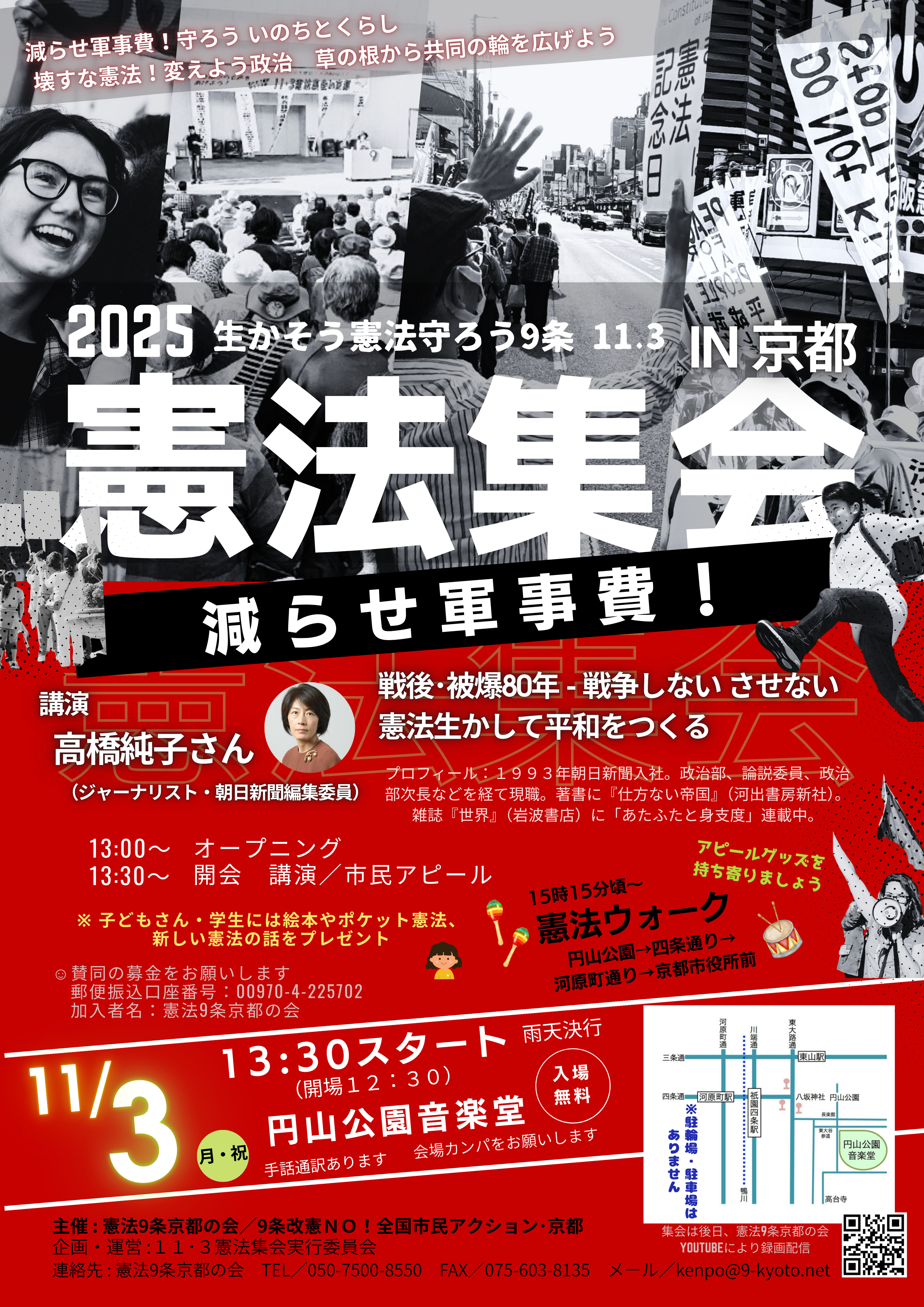 ★【協力団体企画のご案内】 生かそう憲法 守ろう9条 11・3憲法集会in京都 ○日時:2025年11月3日(月・祝) 13:30スタート ○講演:「戦後・被爆80年− 戦争しない させない 憲法生かして平和をつくる」 高橋純子さん(ジャーナリスト) ○会場:円山公園音楽堂 ○主催:憲法9条京都の会 /9条改憲NO!全国市民アクション・京都 ○企画運営:11・3憲法集会実行委員会 詳細は、チラシをご覧ください。 |
